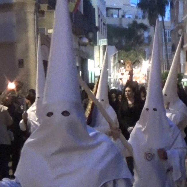 Hermandad Eucarística y Cofradía de Nazarenos de la Santa Cena y María Santísima de Fe y Caridad, a su paso por la Calle Real desde los balcones del antiguo Museo del Aceite, Semana Santa 2018