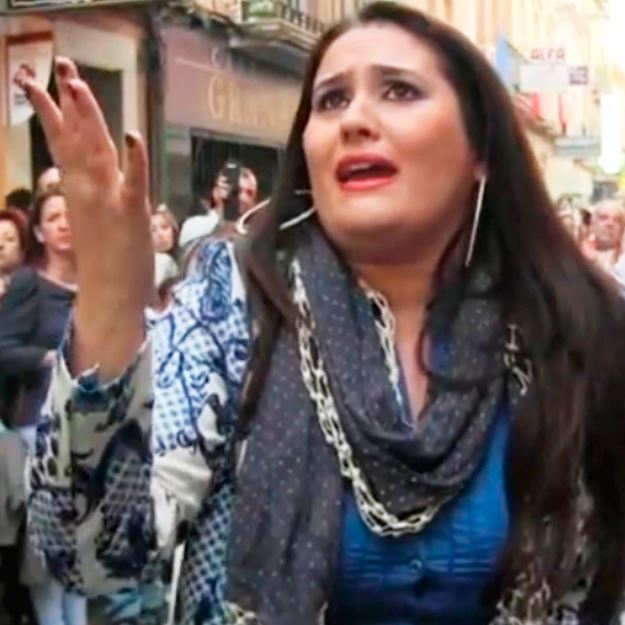 Anabel a la Virgen del Primer Dolor, cofradía del Amor, en la Calle Granada, junto al restaurante Capitol, en la Semana Santa de 2014 de Almería