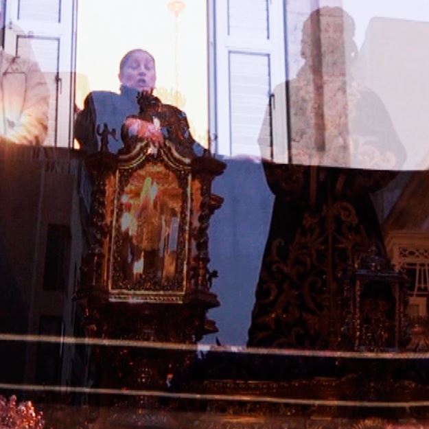 Antonia López al Cristo de Medinaceli de la Cofradía del Prendimiento, a su paso por la calle Martínez Campos, en la Semana Santa 2014 de Almería