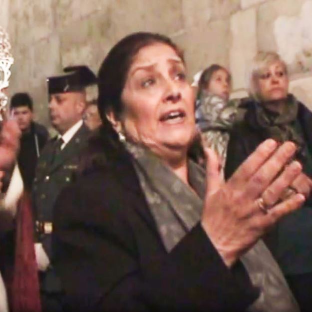 Antonia López a Maria Stma. de la Amargura por carceleras, Cofradía del Encuentro a su paso por el convento de las Claras en la calle Mariana, en la Semana Santa de Almería 2016