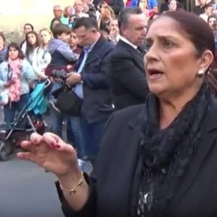 Antonia López a Ntra. Sra. de los Dolores, cofradía del Entierro a su paso por la calle Real frente a Casa Puga, una saeta por carceleras, Semana Santa 2017