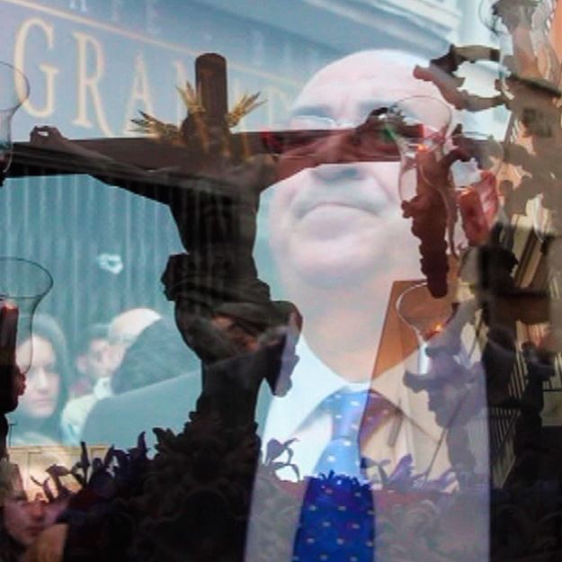 El Niño de la Cuevas al Cristo del Amor a su paso por el Restaurante Capitol en la Calle Granada, en la Semana Santa de 2014 en Almería.