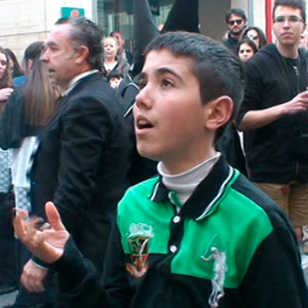 Luís Miguel Iñigo, joven promesa de cantaó. Saeta Seguiriya al Ntra Sra de los Dolores a su paso por la calle Real frente al bar Casa Puga en la Semana Santa de Almería de 2016