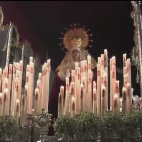 María Canet a la Virgen del Consuelo Cofradía del Silencio, a su paso por la plaza de la Administración junto al Bar Bahía de Palma, en la Semana Santa de 2013 en Almería.