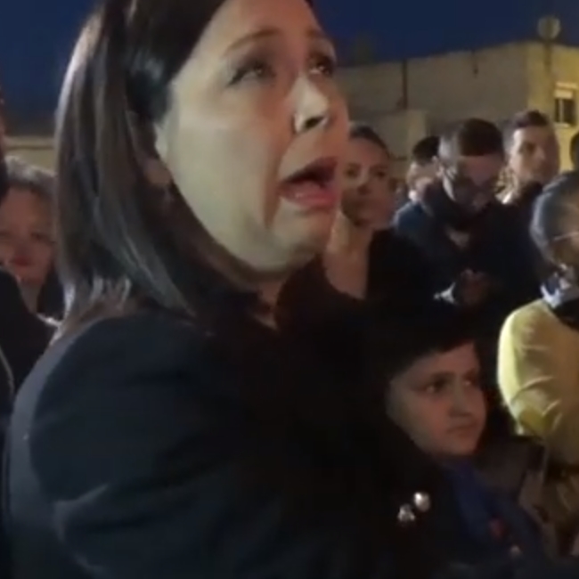 María Canet canta una saeta por seguirilla a debla, la Virgen de la Unidad, el sábado de Pasión en la Semana Santa de Almería, a la salida en la Iglesia de San Ignacio de Loyola. Hermandad y cofradía de Nazarenos del Santísimo Cristo de la Paz y María Santísima de la Unidad, Semana Santa 2019