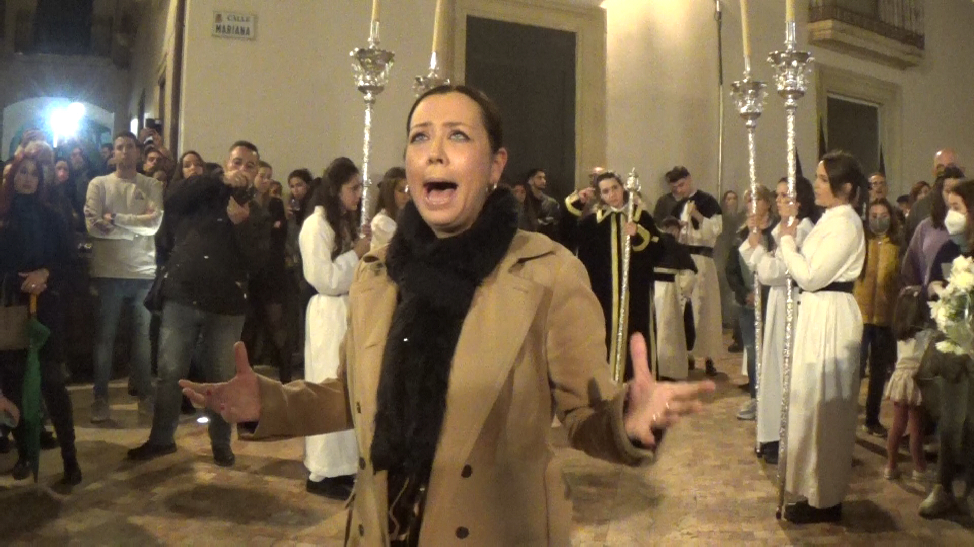 El Jueves Santo, María Canet, canta una saeta a Nuestra Señora de las Angustias, a su paso el Bar Bahía de Palma en Almería, Semana Santa de 2022.