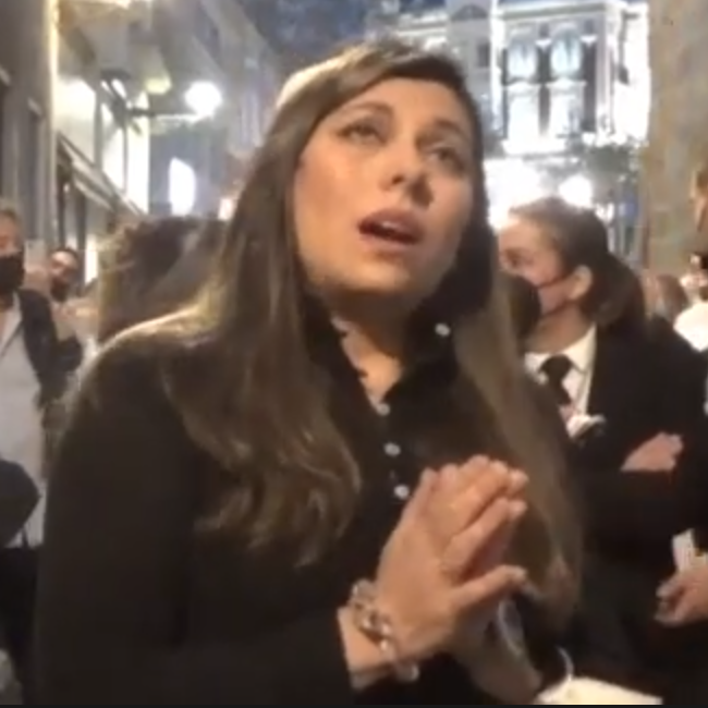 en la calle de las Tiendas, junto a la puerta de la Iglesia de Santiago, al paso de la Cofradía de Los Ángeles, Semana Santa de 2022.