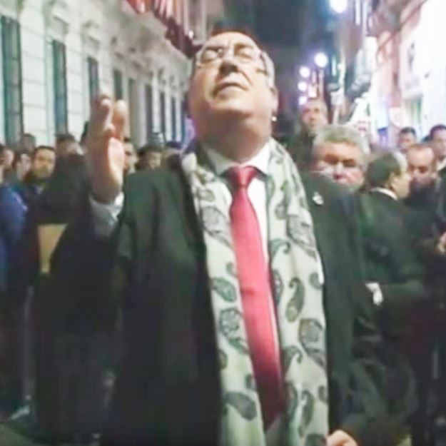 El Niño de las Cuevas al Cristo del Gran Poder, cofradía del Gran Poder, saeta por seguiriya en la esquina de las calles de Navarro Rodrigo y Reyes Católicos, en la Semana Santa de 2016.