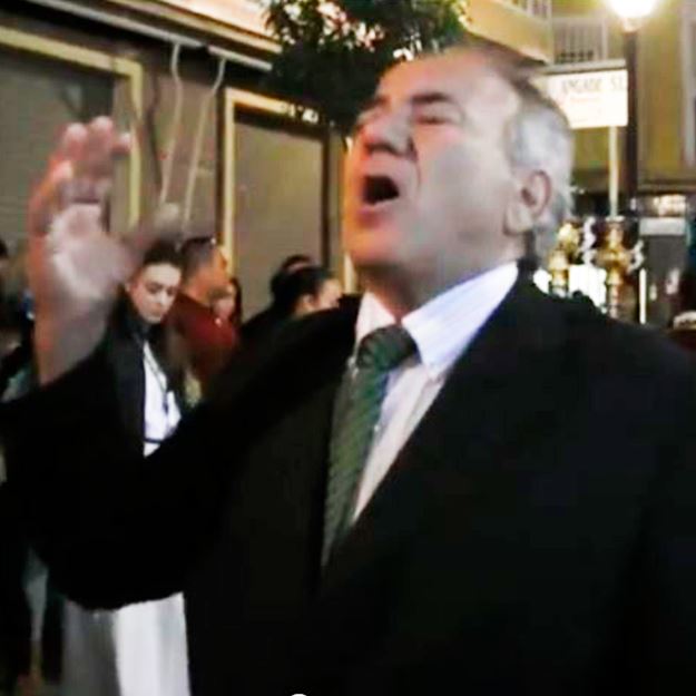 Rafael López a la Oración en el Huerto por martinete, Cofradía de los Estudiantes a su paso por la calle real frente al bar Casa Joaquín , en la Semana Santa de Almería 2015