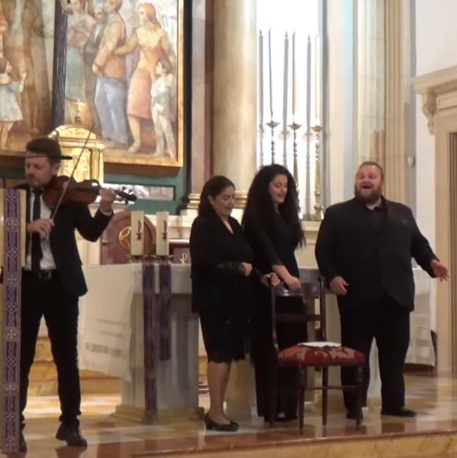 Antonia López, Rocío Segura y Ezequiel Benítez con la Banda Municipal de Almería en el Homenaje a la Saeta el día 30 de marzo de 2023, Iglesia de San Sebastián